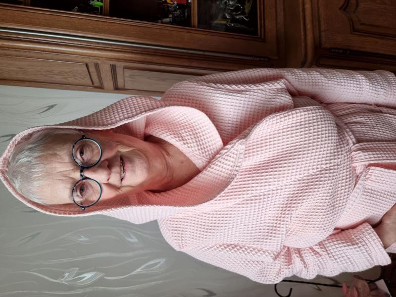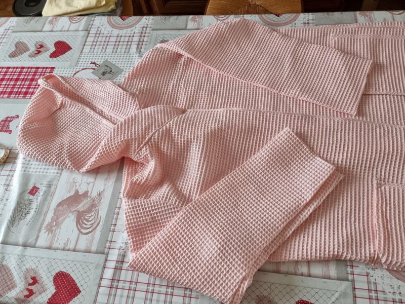 Lors des soldes dans mon magasin préféré, j'ai pu me procurer du tissu "nid d'abeille" à moins 50%. Je n'ai pas hésité ! Pour une sortie de bain, ce tissu est beaucoup moins lourd que du tissu éponge. Cela soulage mon dos ! Et pour ce projet, j'ai repris le même patron que ma robe de chambre. J'y ai juste ajouté une capuche.