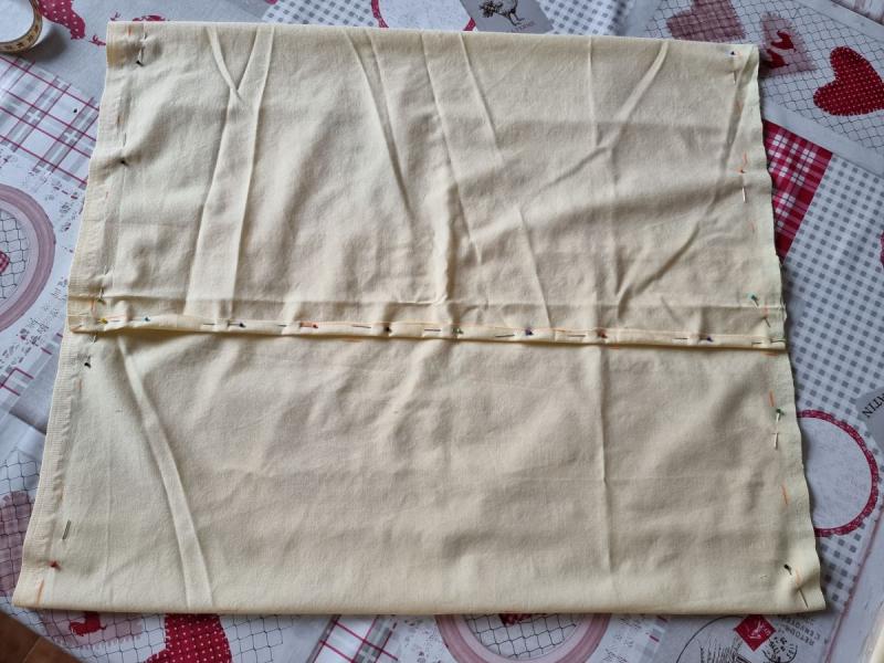 Après avoir marqué le pli de l'ourlet, il faut couper un peu le tissus et faire un petit pli. Je mets des épingles, je faufile, j'enlève des épingles...