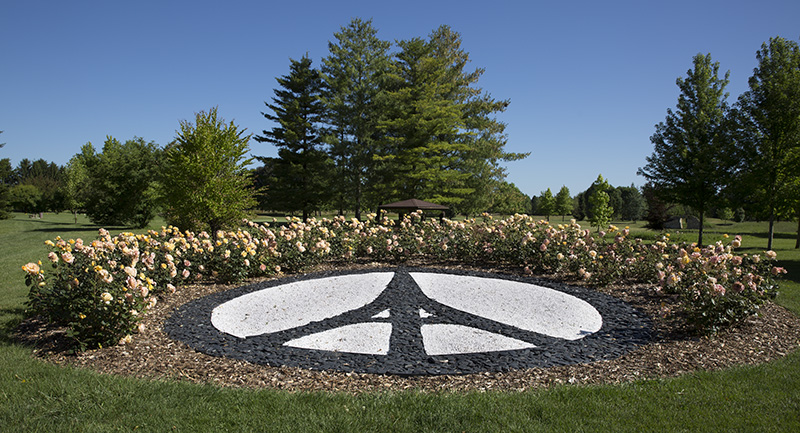 Ces rosiers de type Bataclan (fleurs jaunes) encerclent le symbole de paix Peace for Paris repris au lendemain des terribles attentats parisiens. Un message de paix et aussi de solidarité envers les nombreuses victimes de l’ensemble des actes terroristes.