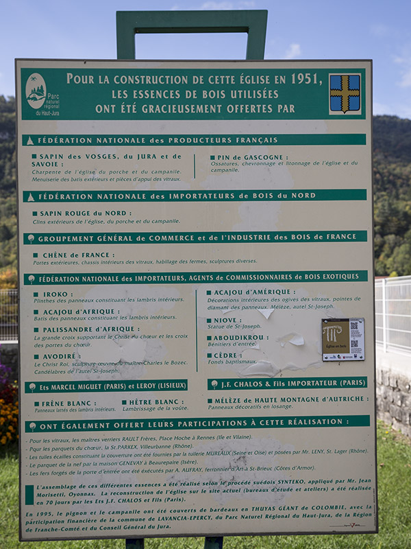 Remontons au mois de juin 1944. Le village de Lavancia , blotti contre la montagne, à trois kilomètres de la rive gauche de la Bienne,est envahi par les troupes allemandes harcelées par les maquisards. Le village est brûlé en représailles, laissant les habitants dans le plus grand des dénuements. Seule la vieille église est épargnée par les flammes. En 1946, les services de la reconstruction dressent le plan d’urbanisme d'un nouveau village qui se trouve cette fois, à la demande des habitants, le long de la route principale entre Bourg-en-Bresse et Saint-Claude, dans "la plaine" pour rejoindre plus facilement les villes voisines demandeuses de main-d’œuvre. C'est ainsi que le village neuf se trouve à plusieurs kilomètres du village dévasté. La vieille église, beaucoup trop éloignée, et ne bénéficiant pas des aides à la reconstruction, est abandonnée, vendue à des particuliers et tombe en ruines. CLIC ! Lavancia se retrouve sans clocher. La commune et la paroisse n'ont pas les moyens de financer la construction d'une une nouvelle église. En octobre 1951, Edgar Faure, député du Jura et ministre du budget, lors de sa visite de l’exposition internationale du bois à Lyon, admire une église toute en bois, chef-d’œuvre de l’exposition. A l'issue de cette exposition, l'église doit être tout simplement....détruite ! Edgar Faure réussit à obtenir la gratuité du don, du démontage, du transport et du remontage du monument à Lavancia, le tout en quelques semaines ! Un véritable tour de force. L'église est consacrée en juin 1952. "De cette symphonie du bois, naît l’atmosphère de recueillement propice à la prière " ainsi parle Monseigneur Flusin à cette occasion. Faisons le tour de l'édifice, de dimensions modestes (20 m sur 10)