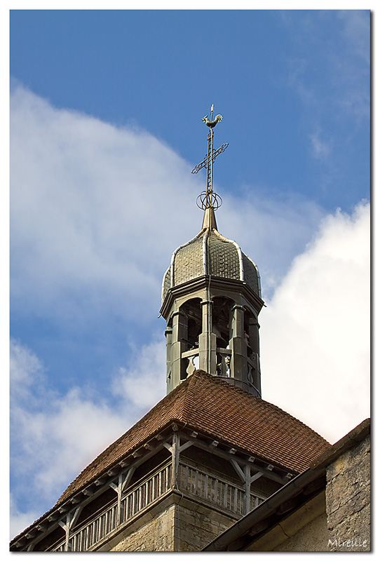 Voici le clocher de l'église d'Orgelet (Jura), où fut baptisé Cadet Rousselle, et le superbe pavage qui orne le porche principal. Allez visiter cette petite cité d'un seul clic!