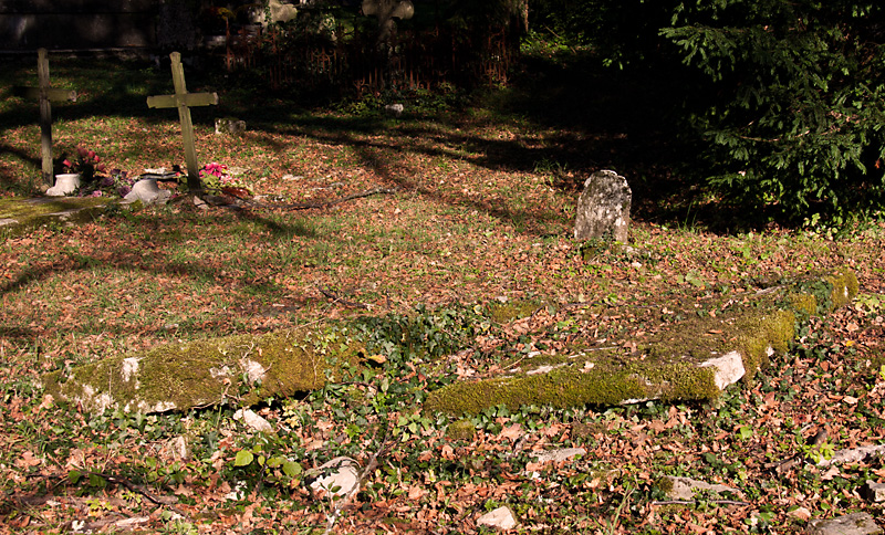 La chapelle est entourée d'un cimetière où les arbres ont tout bouleversé.