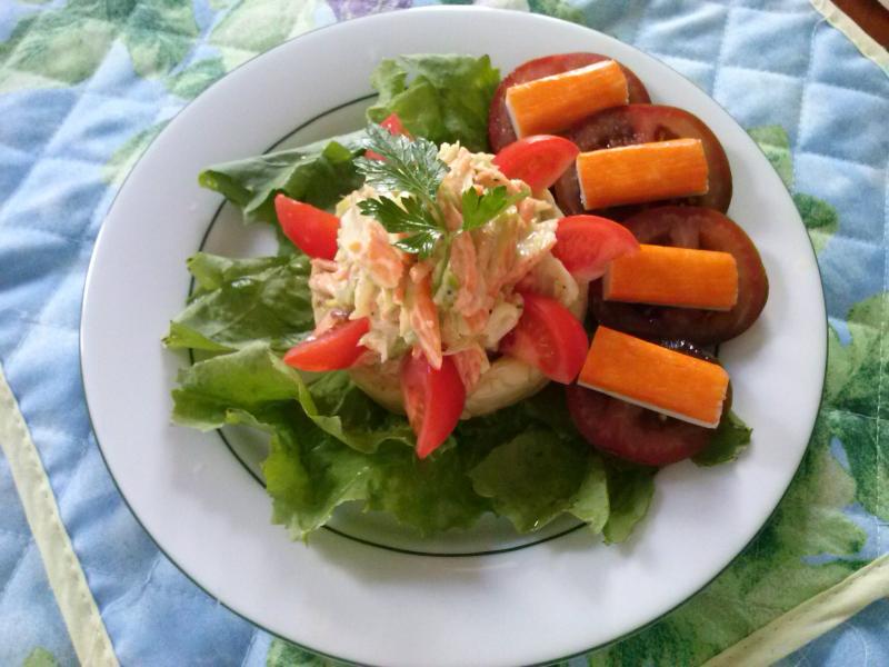 Je vous met la recette, maintenant que je vous ai fait saliver. 2 pamplemousses coupés en deux 1 pommes émincée, 1 boite de crabe, 1 brin de cébette ciselée, poivre , sel, vinaigre balsamique, huile olive, et une touche épicé ( par exemple tabasco). quelques feuiiles d'endives. |