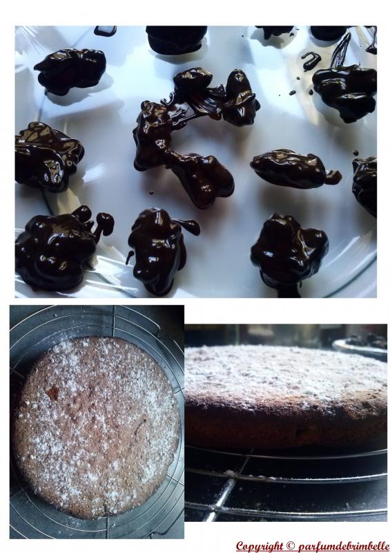 Comme vous voyez 'ai utilisé un moule Charlotte pour changer un peu Quant à sa compsition la voilà: Composition ingrédients 60 g de chocolat 70% 200 g de farine T65 180g de beurre fondu 4 oeufs 180 g de sucre roux 1 cc de levure chimique 1 c c de gingembre moulu Le même travail que pour un quatre-quart. Faire fondre au bain-marie cholocat et beurre. Dans un saladier fouettez oeufs et sucre, puis ajoutez la farine, la levure, bien mélangez . Puis le mélange choco-beurre et le gingembre. Beurrez et farinez votre moule. Cuisson 180°C pendant 40 minutes Quant aux gourmands , gourmandes on laisse refroidir.
