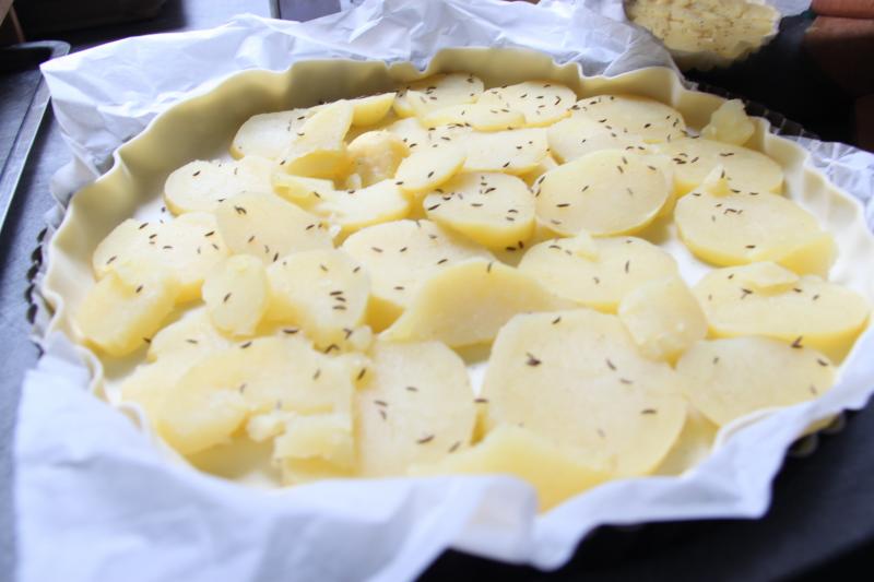 Nous sommes en Automne, et les jardins sont sous des parfums, qui..plus soutenus enrobent l'air de nos cuisines. Le chou y tiens une bonne place, la pomme de terre... la douceur, la morteau et le cumin, une note vivifiante de l'est, l' oignon nous rappelle que nous devons nous couvrir. 2 pâtes feuilleté 1/2 chou blanchi des pommes de terres cuits 200 g oignons hachés revenus dans de la graisse de canard huile - 200 g de crème mélangée à 2 oeufs entiers déposés au dessus du chou sel - poivre cumin 1 saucisse morteau coupée en rondelles et dorée un peu à la poêle 1- les pommes de terre 2 cumin 3 -saucisse 4- chou émincé 5 - crème-oeuf |