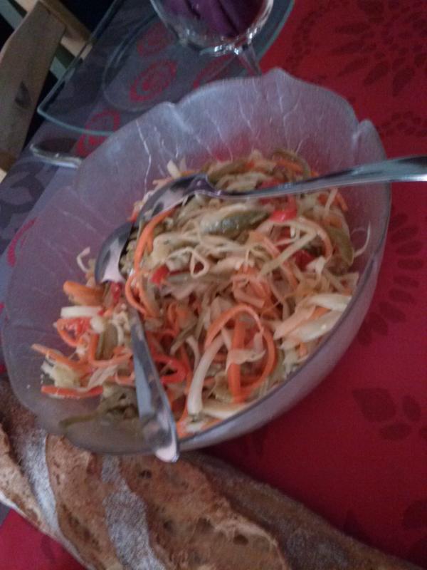 Dimanche en flanant sur le marché, ma moitiè avait envi de racines colorées. Pourquoi pas. Entre carottes rouges/bordeaux (ce pourrait être pour un générique du vin). Hiii....hi.... Le voilà, investissant mon espace. - Quelques feuilles de salade chêne verte - 1 carotte rouge râpée - 1/2 boule de betterave blanche détaillée à la mandoline - quelques cacahuètes - des tomates cerises Pour la vinaigrette : - huile de sésame - huile olive - vinaigre de cidre- se - poivre Et pavé de cabillaud cuit à la poêle. |