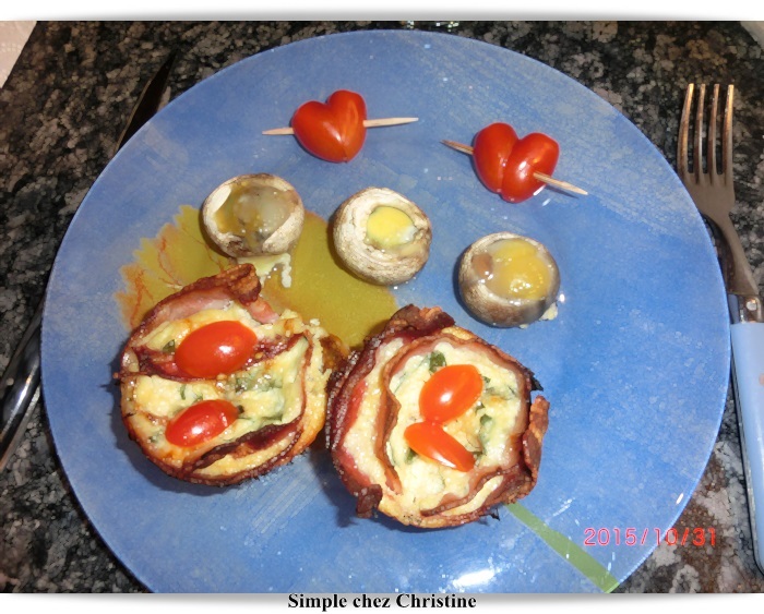 Champignons au fromage frais, salade, coeur de tomates cerise. Champignons aux oeufs de caille, muffins lard, petits coeur de tomate cerise