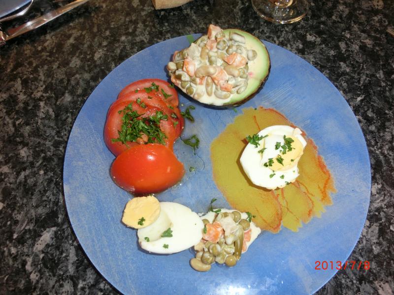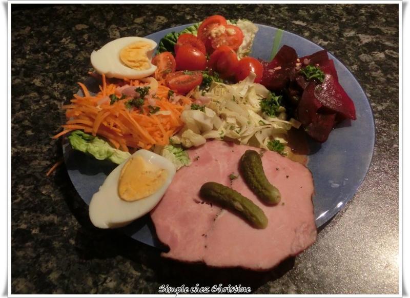 Une petite assiette froide, composée de crudités, un oeuf dur et de charcuterie comme repas du soir.