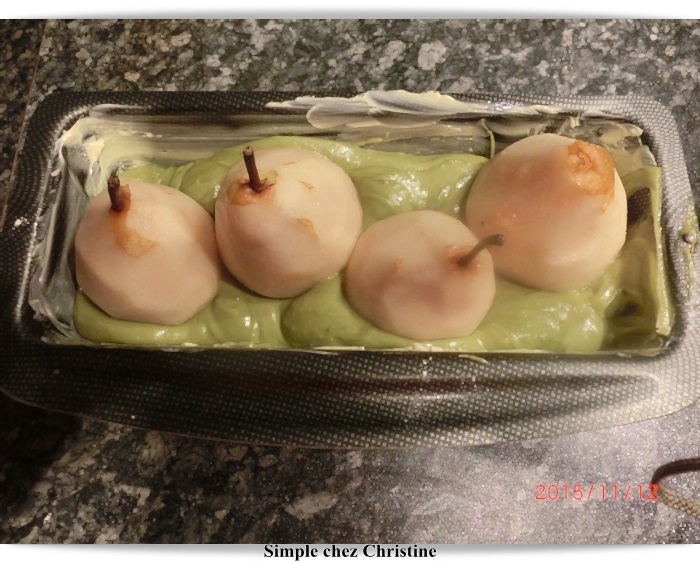 120 gr de sucre 150 gr de beurre 3 oeufs 150 gr de farine 1 paquet levure chimique 1 càc de thé matcha Epluchez les poires en gardant la queue et les évider légèrement. Dans le Thermomix, mettre le thé et la moitié du sucre et mixer pendant quelques secondes.