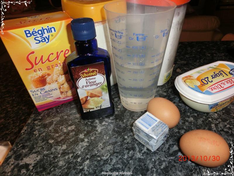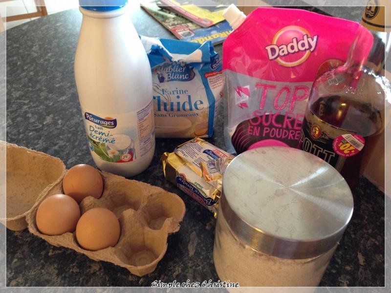 125 r de sucre 4 oeufs 50 gr de beurre fondu 4 oeufs 250 ml de lait 2 sachets sucre vanillé mélanger tous les incrédients, la farine avec le beurre fondu, le sucre, les oeufs un par un, le lait