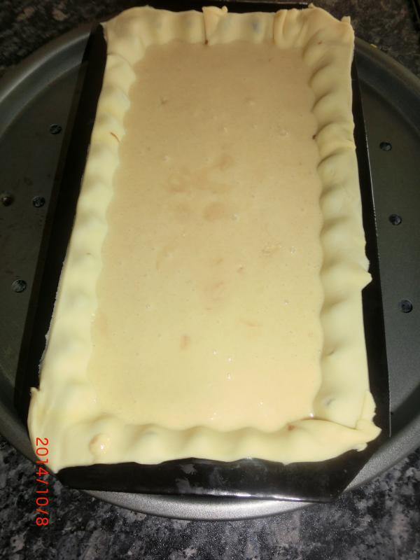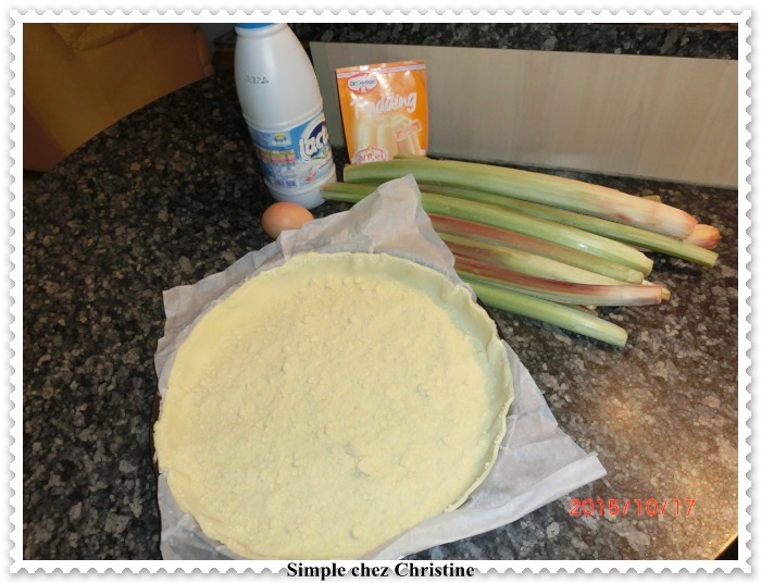 1 pâte feuilletée du commerce rhubarde poudre d'amande Pour la crème 1 oeuf un demi paquet de pudding 250 gr de lait la recette vous l'a connaissez !!