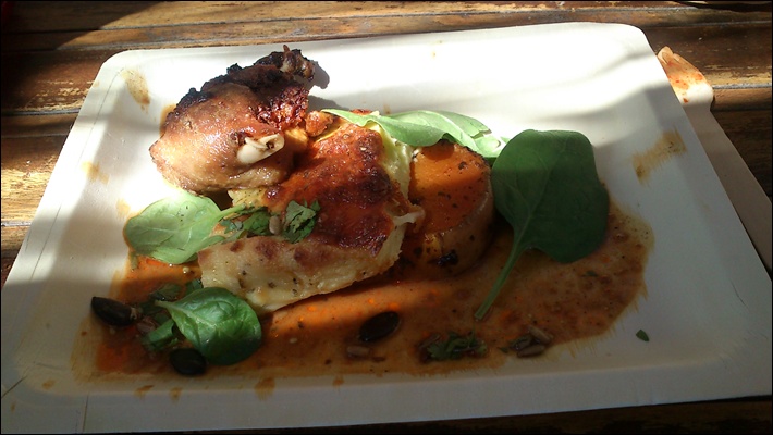 le plat, une cuisse de canard , pavé de polenta , potiron sauce au miel