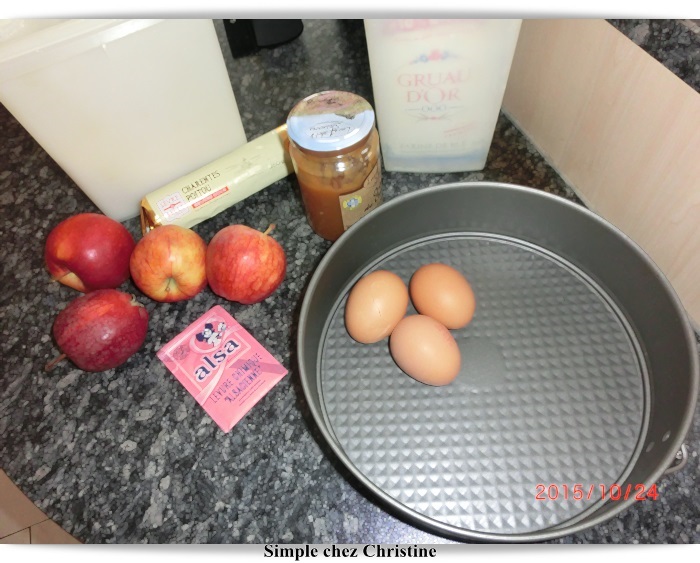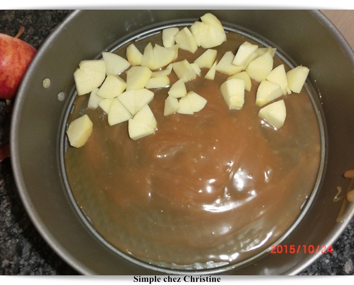 caramel au beurre salé pour moi vous pouvez faire votre caramel avec 90 gr de sucre 3 c-a-s d'eau 3-4 pommes 150 gr de beurre mou 150 gr de sucre 150 gr de farine 3 oeufs 1 sachet de levure chimique Verser votre caramel dans un moule à charnière pour moi. Incliner le moule dans tous les sens afin de couvrir le fond du moule de caramel. Peler les pommes et les couper en petits morceaux. Les déposer sur toute la surface du moule en recouvrant le caramel.