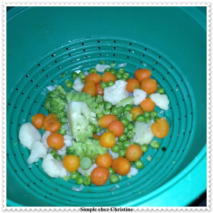 Il faut manger 5 légumes et fruits par jour, pour ce plat les légumes sont à jour, épinards, tomates,petits pois, carottes et persil + un féculent.