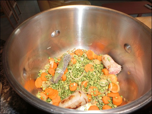 200 gr de pois cassés 2 saucisses à cuire fumées pour donner le gout 2 carottes oignons bouquet garni faire revenir les oignons, les saucisses, les oignons doivent être translucides, ajouter les carottes coupées en rondelles, les pois cassés