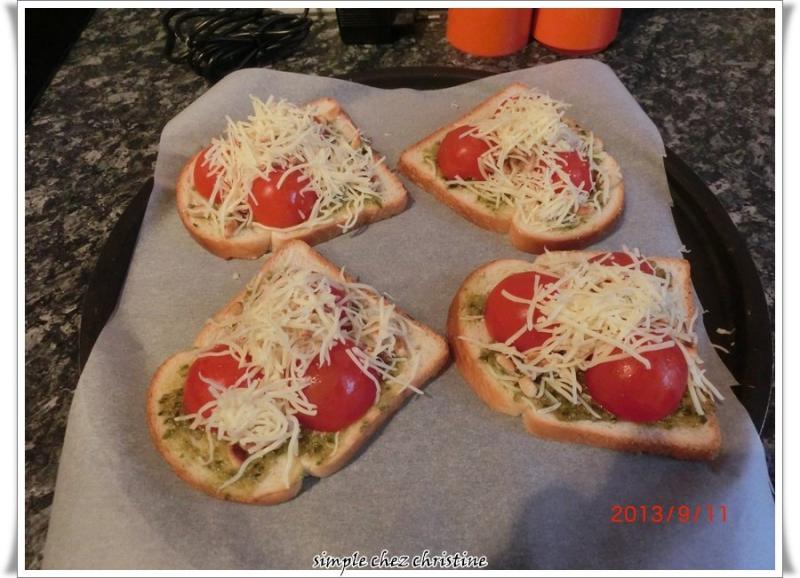 Déroulez une pâte feuilletée, avec une règle découpez le sapin comme sur la photo sur un côté badigeonnez du pesto vert, sur l'autre côté des tomates séchées mixées avec de pignons de pin