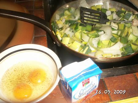 ajouter 3 belles courgettes coupées en dés 1 bouquet de persil sel poivre une fois cuit ajouter 3 grosses biscottes concassées( la courgette rend de l'eau) et 3 oeufs ...mettre dans 1 moule à cake et direction le four à 200° 3/4 d'heure