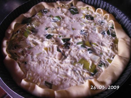 j'avais dans mon frigo: 4 tranches de saumon fumé 1 gros poireau 2 oeufs 1 petit break de crème allégée (toujours!!!) et 1 rouleau de pâte feuilletée J'ai coupé mon poireau en petits morceaux et l'ai fait cuire avec de l'huile d'olive (je trouve que cuit de cette façon, le poireau libère + son goût!!) ...sur mon fond de pâte, j'ai disposé mes tranches de samon fumé ...puis mon poireau cuit et enfin la crème + les 2 oeufs et "oubli" du comté râpé (on doit le voir dans le bol!!!) ne pas trop saler à cause du samon fumé
