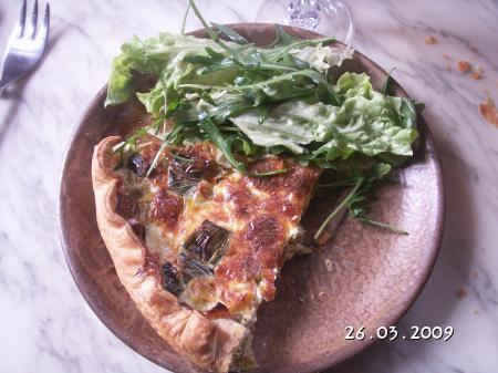 l'autre jour en allant voir mon petit zouquet (qui va bien!!) ma fille m'a dit : le Papy m'a donné des poireaux et si on se faisait 1 tarte aux poireaux? et si on ajoutait aussi 1 boîte de thom??? OK !! je suis désolée , je ne suis pas encore 1 "pro" et n'ai pas tout pris en photos mais je vous montre quand même!!! sur 1 fond de tarte elle adonc disposé son thom émietté puis ses poireaux (cuits et bien égouttés) ell a ajouté 1 petit brick de crème (allégée : nous faisons attention à notre ligne!!!hihihi) qu'elle a mélangé avec 2 oeufs entiers sel quelques tours de moulin et.... ....du Comté!!!! of course, elle est Jurassienne!! on est chauvin ou on ne l'est pas!!!! un petit tour dans le four à 190°pendant 1 grosse 1/2h (on me voit même avec mon petit garçon avec le reflet dans la vitre!!!) ....et voilà!!!!! elle n'est pas belle sa tarte au thom-poireaux!!!! moi, je dis que oui et en +, elle était hyper bonne!! |