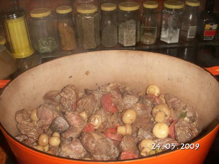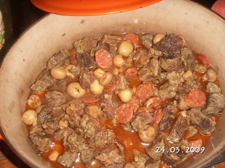 hier j'ai acheté des morceaux de "bourguignon" et j'ai eu envie de faire ce plat que j'adore!! donc il vous faut : une vingtaine de morceaux de bourguignon (que je coupe en gros dés) un chorizo fort (que je coupe en rondelles!) 2 échalottes "cuisses de poulet, j'adore!) hachées 4 gousses d'ail (en enlevant bien le germe qui n'est pas bon à la santé) 1 gros bol de petits champignons 1 branche de laurier (j'ai utilisé la moitié) et " au boulot"!!!!!!! dans une grosse cocotte en fonte j'ai fais chauffer 3 cà s d'huile d'olive et... j'ai fait revenir tous mes petits dés de boeuf ...j'ai ajouté mes échalottes que j'ai bien fait revenir avec ma viande...