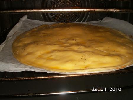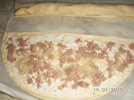 sur un fond de pâte brisée, disposer une pâte à choux, un jaune d'oeuf pour faire briller et au four 200° ma mamy Marie en faisait d'énormes, dans de grandes tôles!!! un régal!!!! |