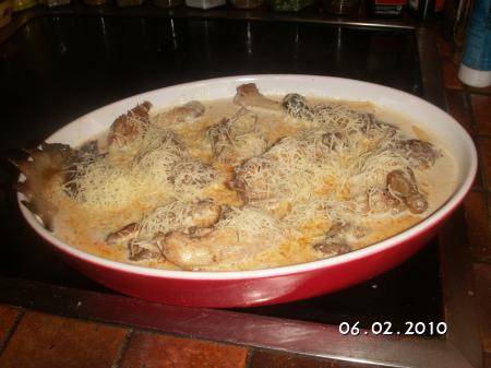 Je m'en vais vous conter la recette du célèbre "poulet à la Gaston Gérard" mais revu à la mode jurassienne!!! C'est à dire qu'au lieu de mettre du Chassagne-Montrachet je mets du Vin Jaune Cette recette avait été réalisée par l'épouse de Gaston Gérard, maire de Dijon (qui était à l'origine de notre foire gastronomique qui a lieu tous les ans au mois de novembre depuis...1931) !!!!! Je coupe un poulet de Bresse en morceaux et je les fais dorer dans une cocotte avec 2 échalottes entières , 2 gousses d'ail entières , sel, poivre, et je saupoudre d'1 cà c de paprika Je laisse cuire 1h environ Puis je retire mes morceaux que je mets dans un plat allant au four Je retire ail et échalotte et dans ce jus j'ajoute : 1 grosse cà soupe de moutarde de ...Dijon (of course!) 150g de Comté du Jura (of course également)!! 1 bon verre de vin Jaune, voilà le détail qui change mais je suis chauvine!!! Je fais bien fondre tout ça pour que cela fasse une sauce bien liée puis j'ajoute... 500g de crème épaisse (eh oui soyons fous!!!) pas de crème allégée, non non!! de la bonne grosse crème bien épaisse et je fais fondre, la sauce peut bouillir pas de problèmes! Je rectifie l'assaisonnement et je verse sur mes morceaux de poulet je mouline du Comté par-dessus et ...au four pour 1/2 h pour que le Comté fonde bien et prenne un peu de couleur Je sers ce plat DIVIN avec du riz rose ou noir suivant mon humeur!!Ne mettez pas de légumes "forts" car leur goût casserait celui de cette sauce... Essayez Mesdames, vous allez voir , tous vos invités vous feront des éloges et vous diront "quand est-ce que tu nous fais ton poulet à la Gaston Gérard!" !!!! Allez au fourneau!!! J'ai emprunté la photo à "ces petits moments" car je ne l'ai pas cuisiné ce matin, eheh!!! Je trouve en effet qu'un article est plus joli avec une photo! Mais je vous mettrai "ma mienne" la prochaine fois que je le cuisinerai, promis!