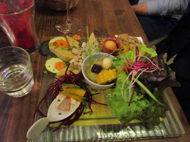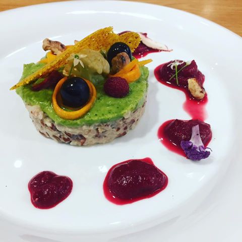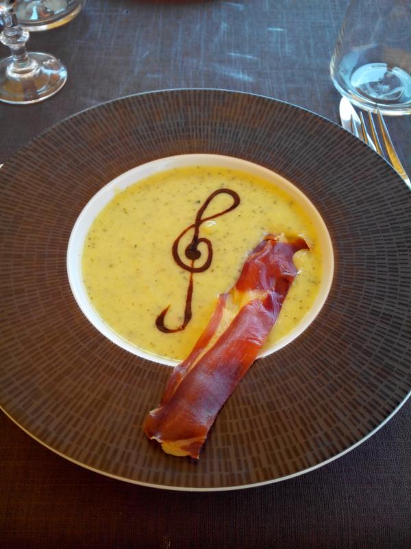 coupe de courgettes à la menthe et son crémeux de chèvre salade de museau maison rillettes de daurade sur son craquant salé cuillère de foie gras plat : cailles farcies au foie gras et cèpes coulis de poivrons et purée de panais desserts: clafoutis aux muscats tarte chocolat myrtilles au crémeux de citron |