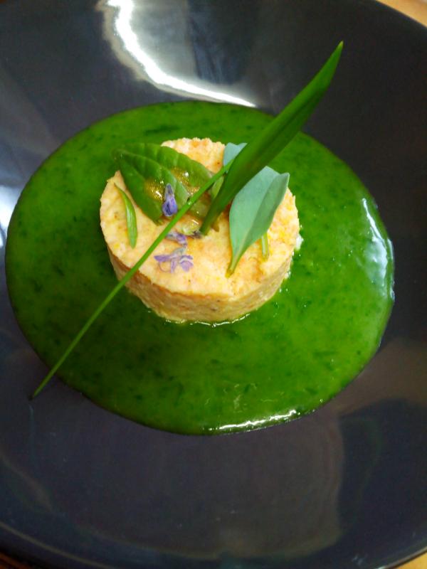 Crémeux de mozzarella à l'ail des ours,asperges, œuf mollet, mélisse, pesto d'ail des ours.