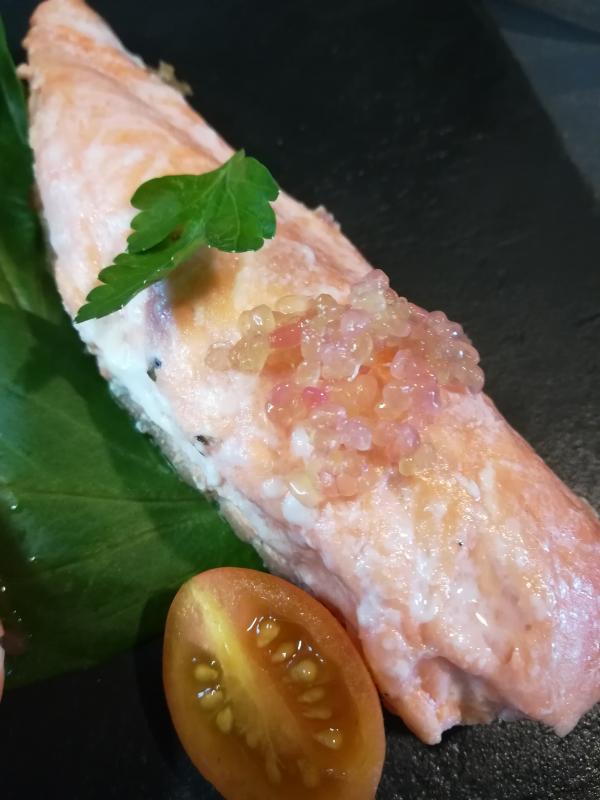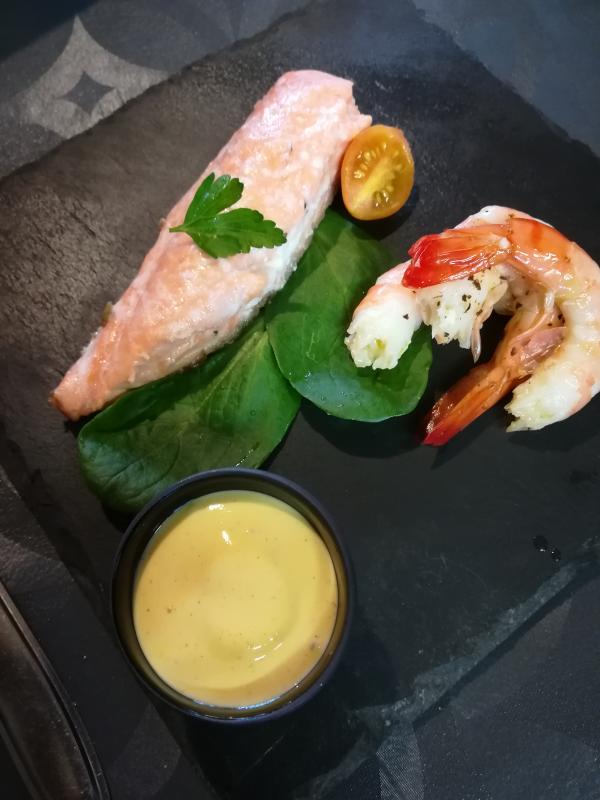 Mariné au citron 🍋 et a l'huile d'olive. Cuite à la vapeur, accompagnée d'une sauce crémeuse au jus de rouget.