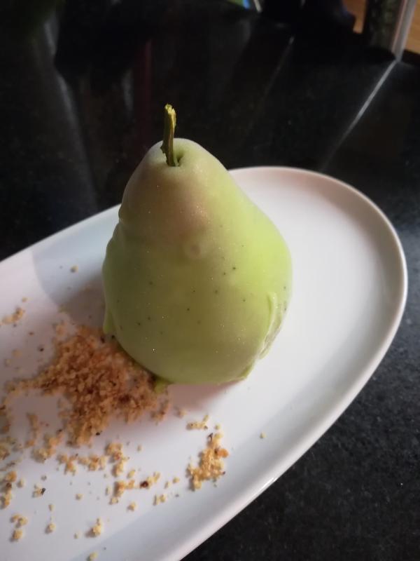 des gressins en pâte à choux aux éclats de pistaches, une mousse chocolat praliné (maison) à la fève tonka, des poires en dés caramélisés avec sur le dessus une feuille de sauge ananas ciselée et ses fleurs un petit régal!!