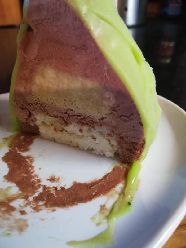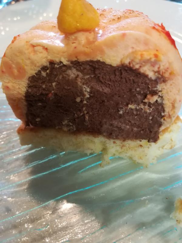 Entremet chocolat, insert orange aux bourgeons de sapins, sponge cake au thé matcha.