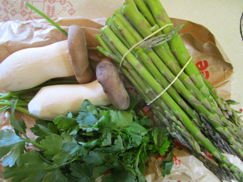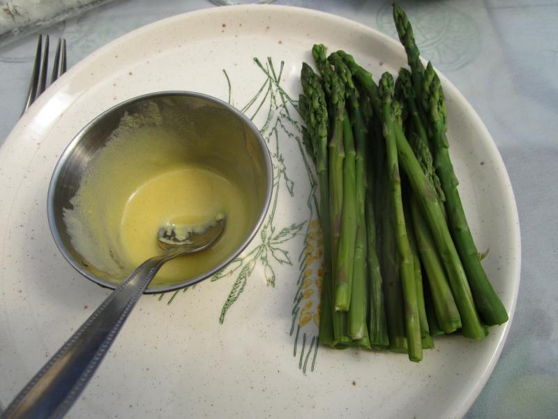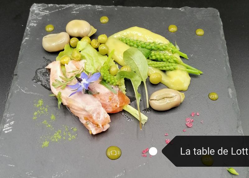 Asperges des bois,jus de cosses de petits pois,saumon gravlax maison.
