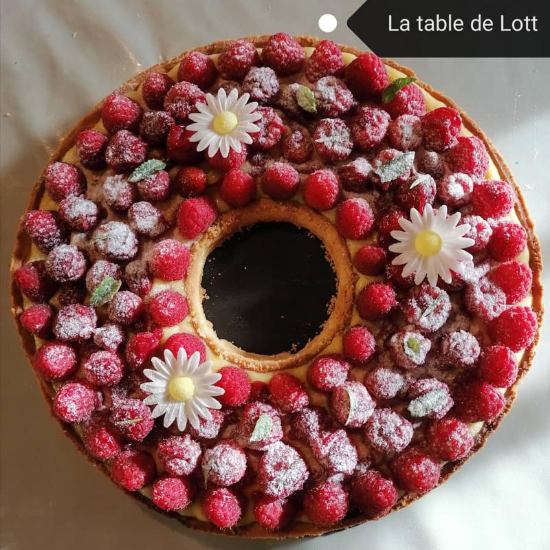 Tarte framboises, crème pistache, crémeux citron sauge coulis de framboises à l'estragon.