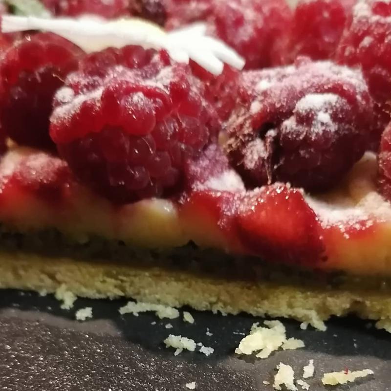Tarte fraises cerises, crème de pistaches, crémeux citron 🍋 à la sauge, pâte sablée amandes. Coulis de framboises.