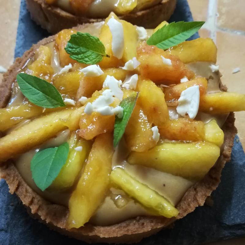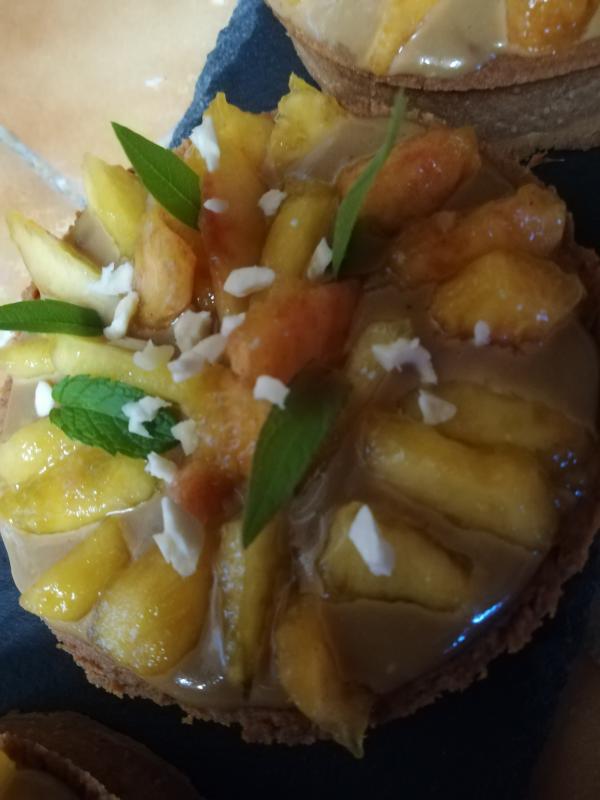 tartelettes aux noix caramel beurre salé; crème de mangue copeaux de coco