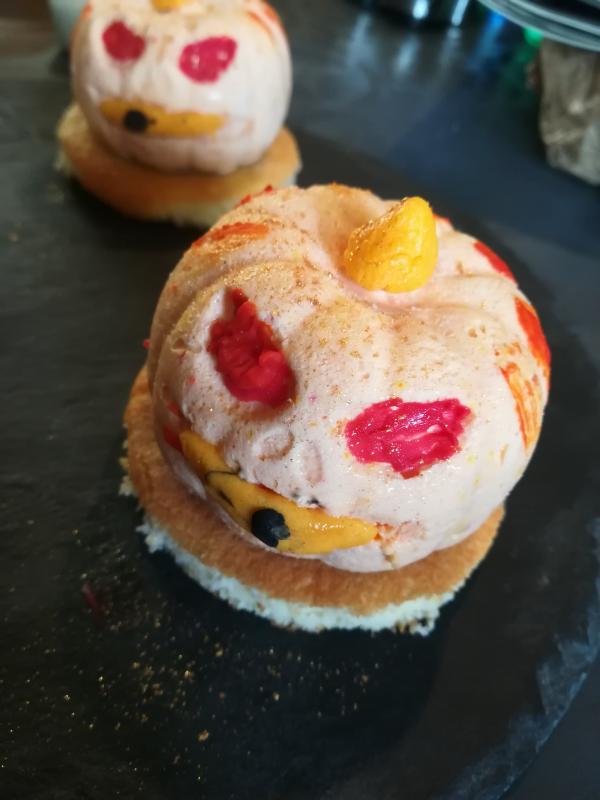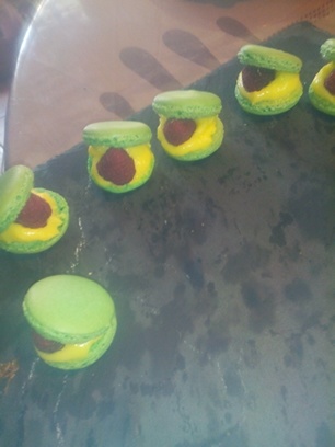 des macarons sublimés par les framboises du jardin et leur caramel un crumble de fruits exotique et enfin une mousse au chocolat tainori à la fève de tonka