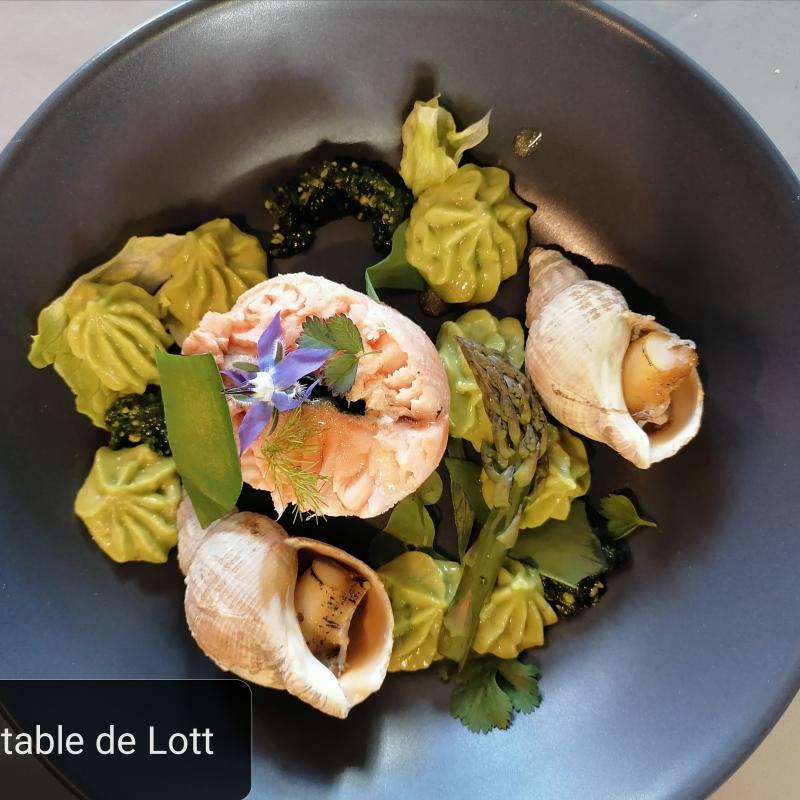 Ballotines de saumon à l'oseille, crème d'avocat au citron 🍋,bulots, pimprenelle,asperges,pesto d'ail des ours.