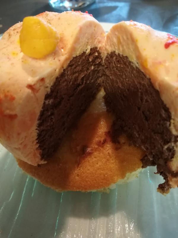 Biscuit joconde, crémeux chocolat, crémeux praliné
