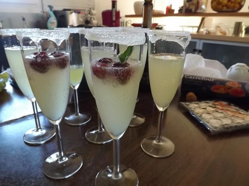 DANS UN SALADIER VERSER 10 CL DE COINTREAU AJOUTER10 CL DE SUCRE DE CANNE 2 JUS DE CITRON VERT ET AJOUTER VOTRE BOUTEILLE DE CHAMPAGNE AGREMENTER DE FRAMBOISES FRAICHES