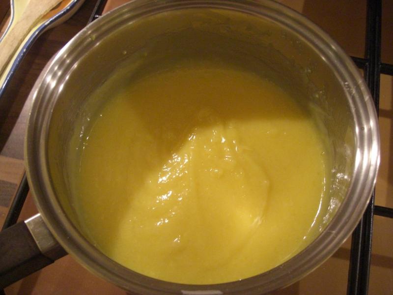J ai fait une creme anglaise en portant a ebullition 50 cl de lait demi ecreme avec de l extrait de vanille.J ai fouetter 4 jaunes d oeufs avec 50 grs de sucre jusqu a ce que le melange blanchisse. J ai verser petit a petit le lait sur ce melange oeufs sucre j y ajoute 1 cuillere a soupe de maizena.Je remets sur le feu tout doux en remuant jusqu a ce que la preparation commence a s epaissir surtout ne pas faire bouillir.Je retire du feu et y incorpore 2 feuilles de gelatine que j ai fait prealablement tremper dans un peu d eau froide.Je reserve jusqu a refroidissement.