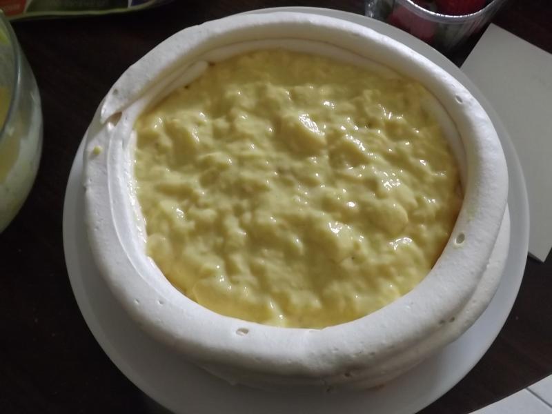 Au moment de manger le dessert je prend on fond de meringue j y ajoute la creme anglaise refroidi et les fruits je saupoudre de sucre glace et hop on deguste.