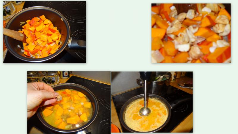COUPER EN TRANCHES PAS TROP EPAISSES LE POTIMARON FAIRE REVENIR LES MORCEAUX DANS UNE COCOTTE EN FONTE SI POSSIBLE AVEC UN PEU DE BEURRE ET D HUILE