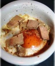 À la sortie du four, parsemez de quelques petits morceaux de foie gras sur chaque oeuf cocote. Servez sans attendre !