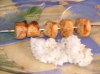 Disposez alors le riz parfumé dans quatre ramequins, tassez bien et démoulez-les dans des assiettes individuelles en retournant doucement les ramequins. Posez-y une brochette de noix de Saint-Jacques par personne et décorez de coriandre fraîche. Servez sans attendre.