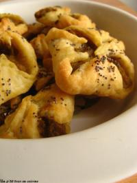 • Déposez une cuillère à café de rillettes sur chaque carré. Repliez-le de façon à obtenir des petits feuilletés, puis parsemez de graines de pavot.