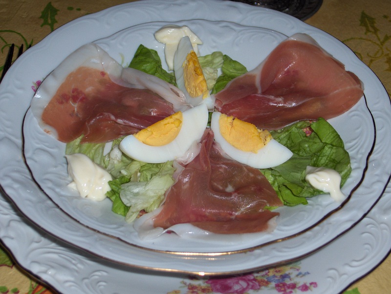 salade oeufs cuits durs mayonnaise Le jour de Noël, avec ce qui me restait de jambon de Parme ayant servi pour les aumônières ( - lien vers la recette "Aumonières au jambon cru" - ) au réveillon, j'ai fait cette petite entrée. Je l'ai servie avec un petit pain chaud et du beurre.