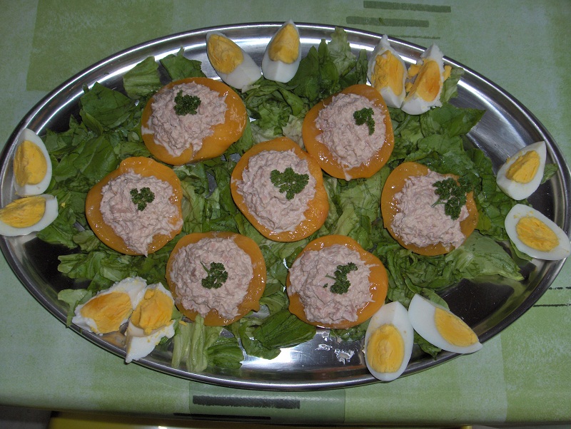 * Mélangez le thon avec la mayonnaise. * En remplir les pêches. Mettre sur un plat (ou sur des assiettes individuelles) de la salade, les pêches, les crudités, etc.
