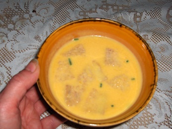 * Mélanger avec le potiron. * Mixer le tout. * Sel, poivre, le bouillon cube. * Et faire cuire. * Servir avec les croûtons et la ciboulette hachée. J'ai oublié de faire une photo quand je l'ai servie. Mais, il me restait un bol pour le lendemain.