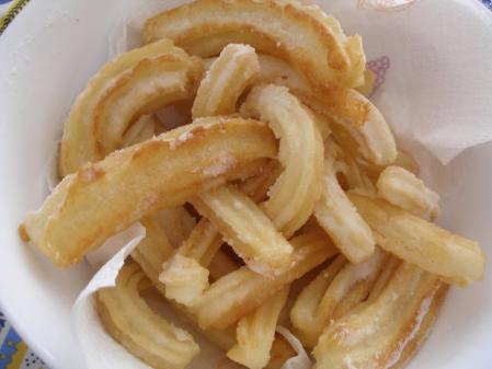 un bol de farine, une pincée de sel , un sachet de sucre vanillé, ajoutez un bol d'eau bouillante, mélangez et mettez dans l'appareil à churros, cuire dans une huile à friture.