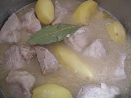 faire revenir le veau dans du beurre, ajouter 2 cuil farine, mouiller avec 3 verres d'eau, 25 cl vin blanc, 2 cubes bouillons, thym, laurier, oignon. Ajouter pommes de terre, carottes. Laisser mijoter 1h30 ou à la cocotte-minute, 20 mn